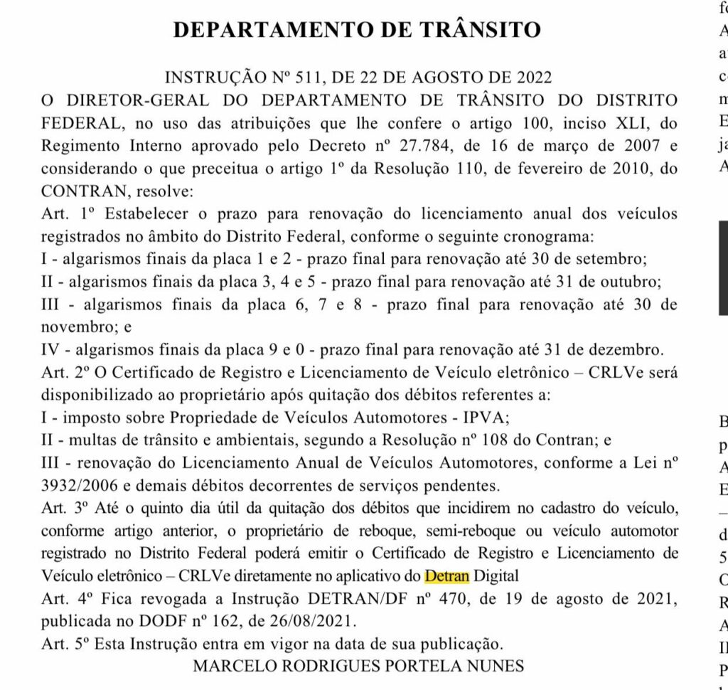 Os proprietários de veículos registrados no Distrito Federal precisam se atentar aos prazos estabelecidos pelo Departamento de Trânsito para renovação do licenciamento anual. A Instrução nº 511/2022, publicada no Diário Oficial desta quarta-feira (24), traz o calendário com os limites de datas para que cada grupo de veículos esteja devidamente licenciado, de acordo com o algarismo final da placa.