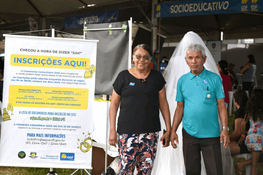 Promovido pela Secretaria de Justiça e Cidadania do Distrito Federal (Sejus-DF), o Casamento Comunitário chega à sua segunda edição em 2025, com cerimônia marcada para 29 de junho. As inscrições já estão abertas e podem ser feitas em diversos equipamentos públicos do DF, bem como durante as edições do programa GDF Mais Perto do Cidadão. Estão previstas mais três edições ao longo do ano, com expectativa de beneficiar cerca de 400 casais em situação de vulnerabilidade – oferecendo a oportunidade de oficializar a união de forma gratuita, digna e inesquecível.