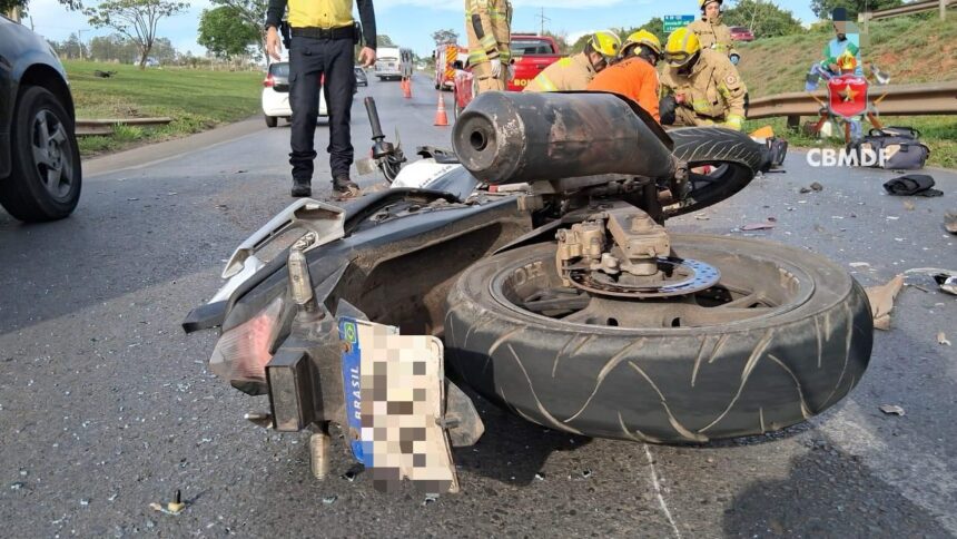 Um motociclista em estado grave foi levado às pressas, nesta segunda-feira (27), a um hospital após se envolver em acidente. A vítima bateu em um carro durante o caso. Segundo o Corpo de Bombeiros Militar do Distrito Federal (CBMDF), o condutor apresentou uma fratura exposta no braço e sinais de traumatismo craniano.