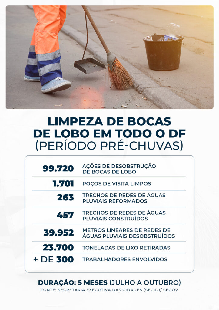 As chuvas começam a aumentar no Distrito Federal, e um dos serviços mais importantes nesta época de muita água são para limpeza e desobstrução de bocas de lobo e bueiros. Uma ação executada em parceria pela Secretaria de Governo (Segov) e a Novacap concentrou esforços nos últimos cinco meses nesta missão. Por toda a capital, um total de 23,7 mil toneladas de lixo foram retiradas dessas caixas, responsáveis por captar a água pluvial. Muitas foram reformadas, e outras, desentupidas (veja abaixo).