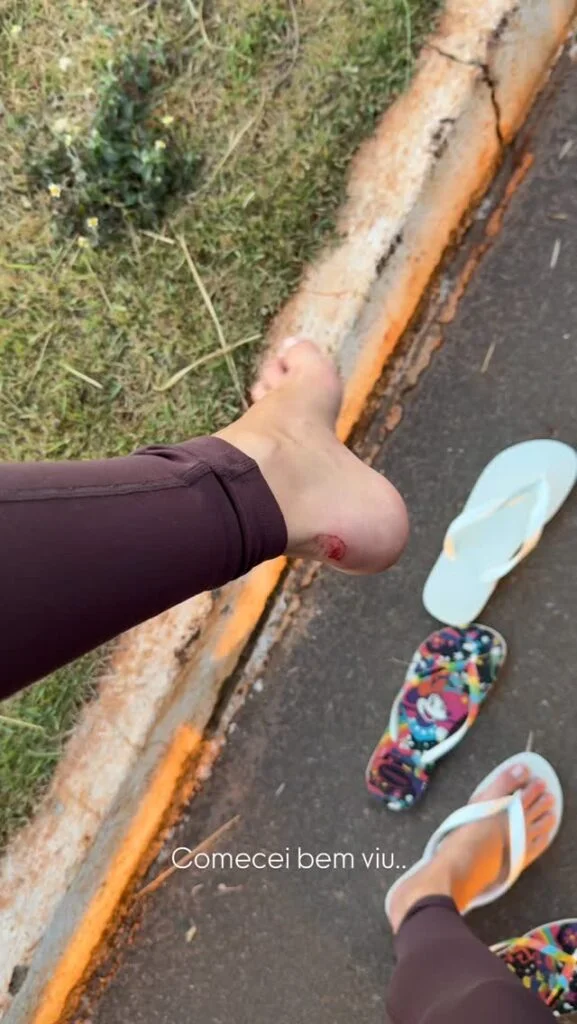 Em outra atualização, a namorada de Murilo Huff chega a mostrar o estado dos pés, com ferimentos: “Porque se não der o sangue, não é penitência. Olha, meu pai do céu.”