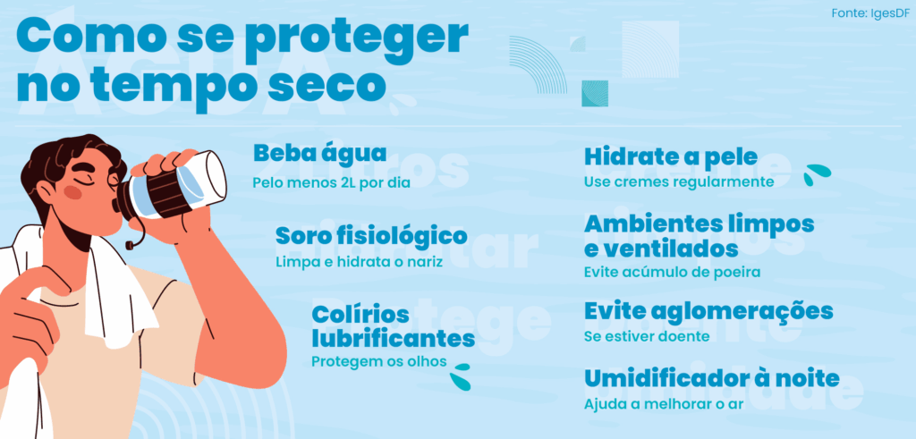 O tempo seco e a baixa umidade do ar, comuns na região nesta época do ano, preocupam médicos e especialistas. Quando os índices de umidade caem abaixo de 25%, nível considerado de alerta pelo Ministério da Saúde, o organismo sofre, especialmente nas mucosas que revestem olhos, boca e nariz. As consequências podem ir de desconfortos leves e infecções respiratórias até o agravamento de doenças crônicas.