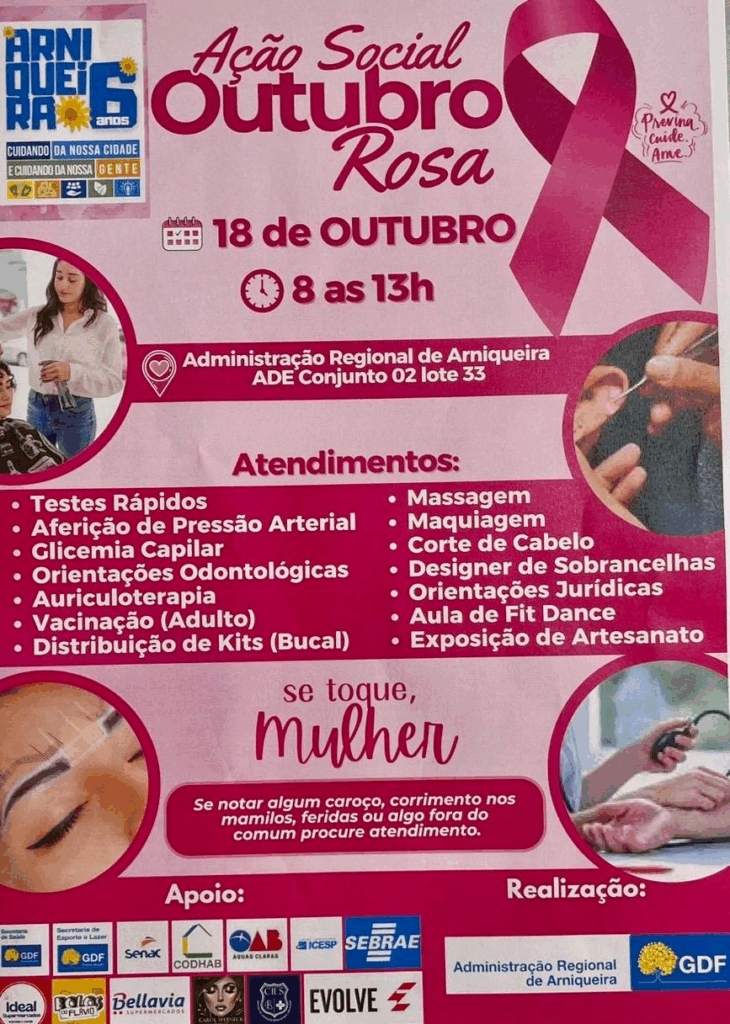 No próximo sábado (18), a Administração Regional de Arniqueira promove a Ação Social Outubro Rosa, evento que integra as celebrações do mês de aniversário da cidade. A programação reúne serviços gratuitos voltados à saúde, à estética, ao bem-estar e à cidadania.