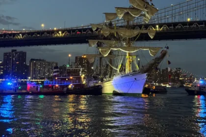 Navio da Marinha mexicana bate na ponte do Brooklyn, em Nova York