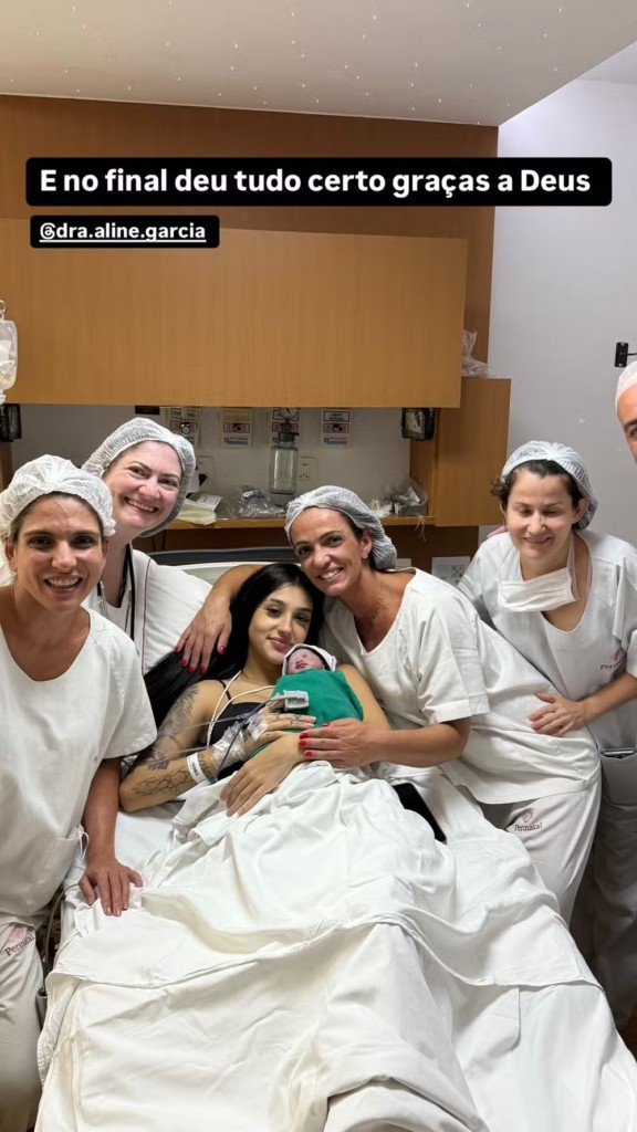 “E no final deu tudo certo, graças a Deus”, escreveu a influencer ao posar com a bebê nos braços, e sem a presença do ex.