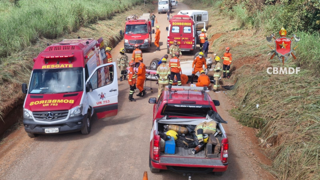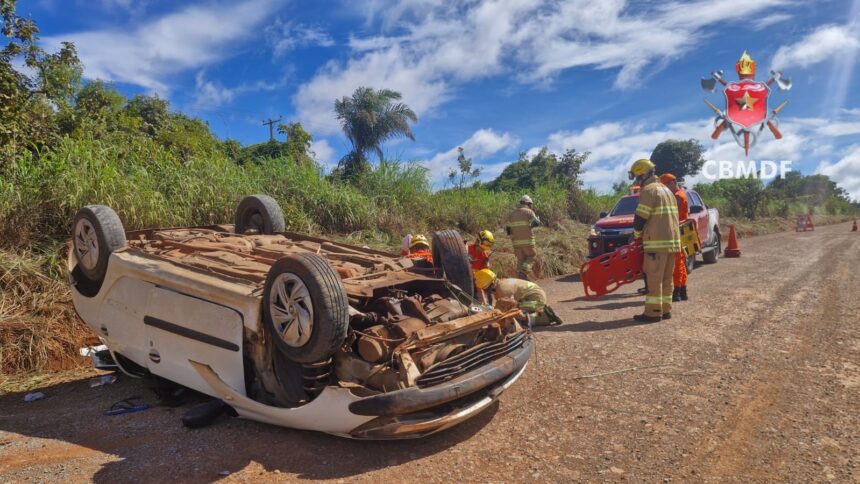 Segundo a corporação, o homem estava com suspeitas de fratura na perna esquerda. Todos (as) foram atendidos (as) conscientes e orientados. As vítimas foram encaminhadas a um hospital. Em uma imagem divulgada pelo Corpo de Bombeiros Militar do Distrito Federal (CBMDF), percebe-se que o carro ficou com as rodas viradas para cima. Veja a seguir: