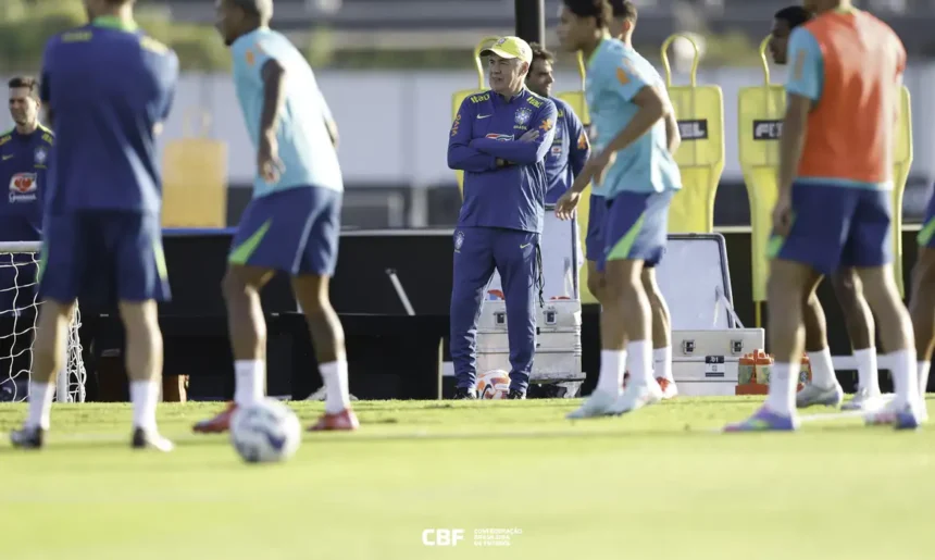 O técnico italiano Carlo Ancelotti comandou, na tarde desta segunda-feira (2), seu primeiro treino à frente da seleção brasileira. A atividade, que serve de preparação para o confronto com o Equador pelas Eliminatórias para a Copa do Mundo, foi realizada no CT Joaquim Grava, em São Paulo.