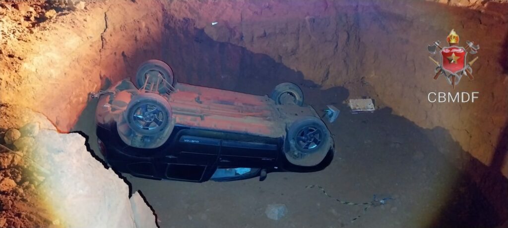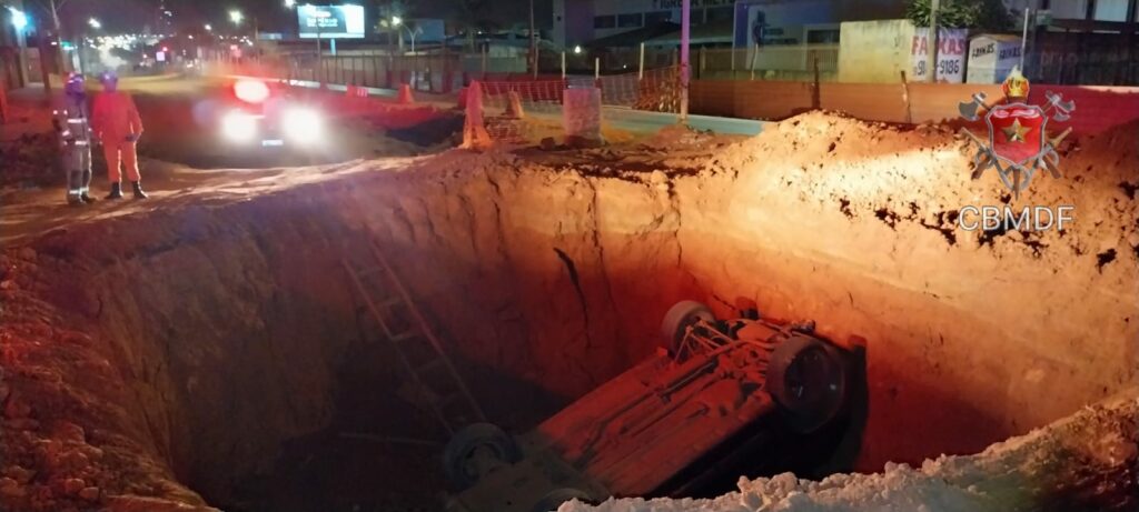 Um carro de passeio caiu na noite desta quarta-feira (10) em um buraco de uma obra na Avenida Hélio Prates, em Taguatinga. O acidente foi na altura da QND 50, pouco depois das 23h.