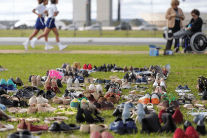 Cerca de 950 pares de sapatos usados foram colocados no gramado da…