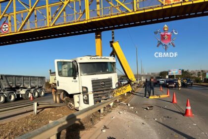 Caminhão bate em passarela e deixa motociclista ferido em acidente com outros veículos na via Estrutural