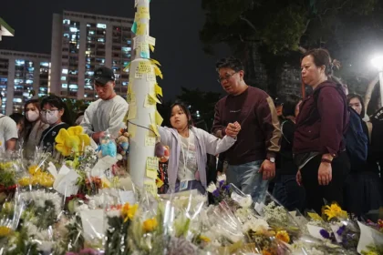Pessoas se reúnem em local de incêndio em Hong Kong