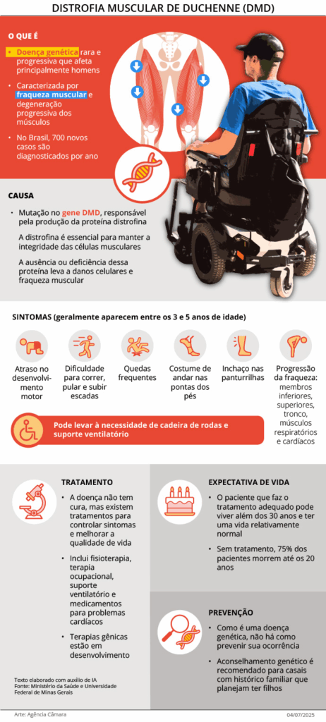 A Comissão de Defesa dos Direitos das Pessoas com Deficiência da Câmara dos Deputados realiza, nesta terça-feira (8), uma audiência pública para debater a incorporação do medicamento Elevidys no Sistema Único de Saúde (SUS).