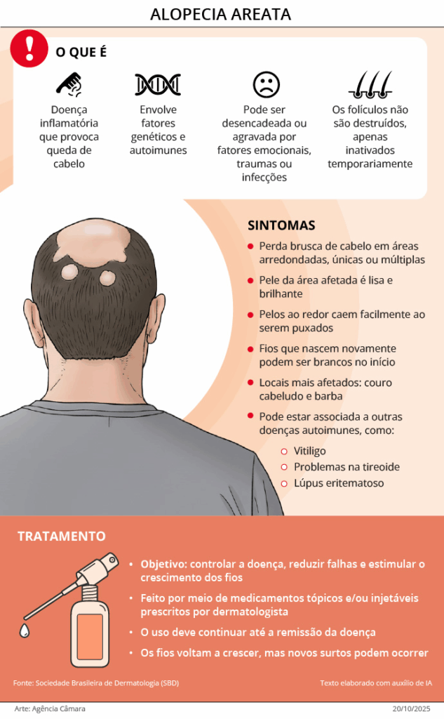 A Comissão de Saúde da Câmara dos Deputados promove, nesta terça-feira (21), audiência pública sobre os impactos da alopecia areata grave e formas de melhorar o atendimento às pessoas com a doença. A alopecia areata grave é uma doença autoimune que causa queda de cabelo em homens e mulheres, principalmente em crianças e jovens adultos.