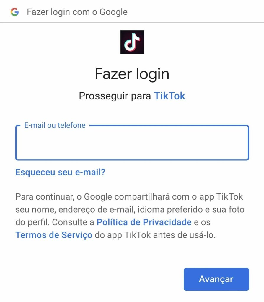 8. Assim como no Instagram, dessa vez você será redirecionado para a tela de login da sua conta Google. Caso já esteja conectado, basta informar qual será utilizada, lembrando que ela precisa ter um canal no YouTube ativo;