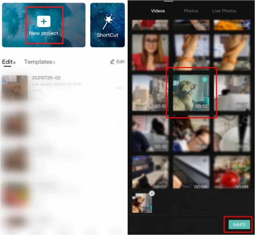 1. Abra o aplicativo CapCut, toque em “Novo Projeto”, no centro da tela, e depois selecione o vídeo em que deseja inserir a música;