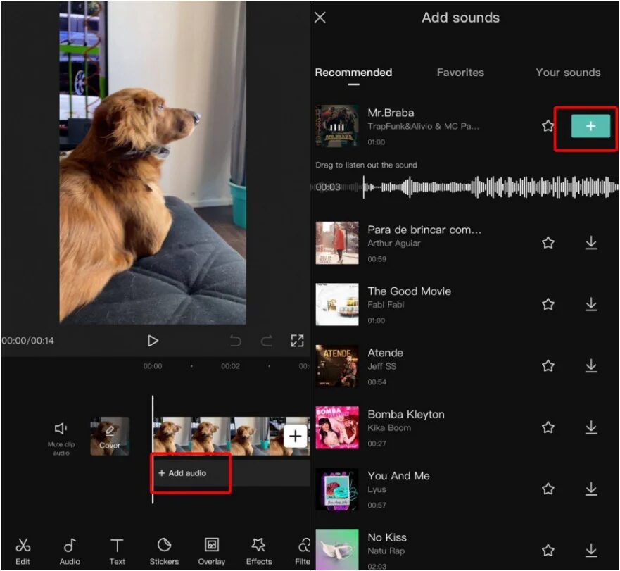 3. Selecione “Add Áudio” e, em seguida, toque sobre a música que deseja adicionar no vídeo. O aplicativo disponibiliza algumas opções de músicas, mas também é possível escolher uma que esteja baixada no seu celular. Após tocar no símbolo da setinha para transferir a música para o app, selecione “+” para finalizar;