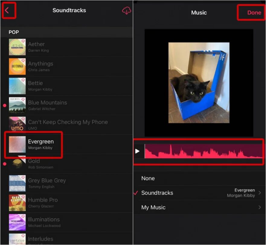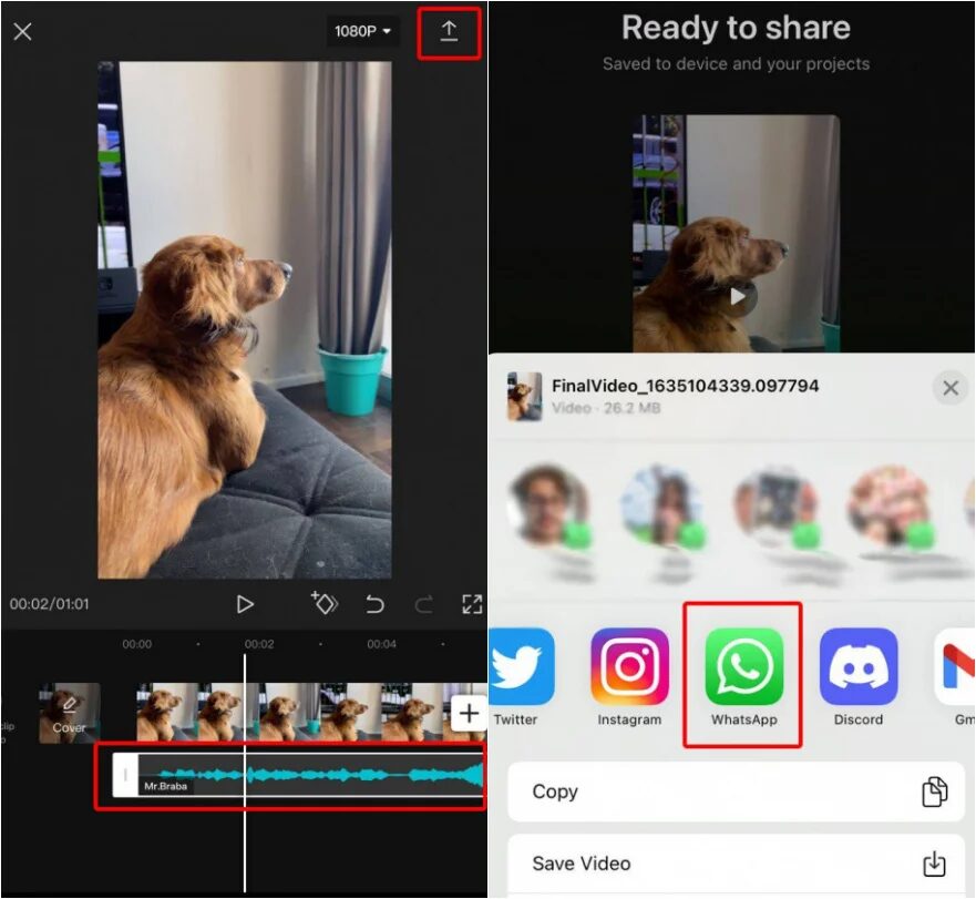 4. Para realizar o ajusted a música com o vídeo, clique no trecho branco da faixa e arraste para a esquerda ou direita. No final, toque no símbolo de exportar na parte superior direita;