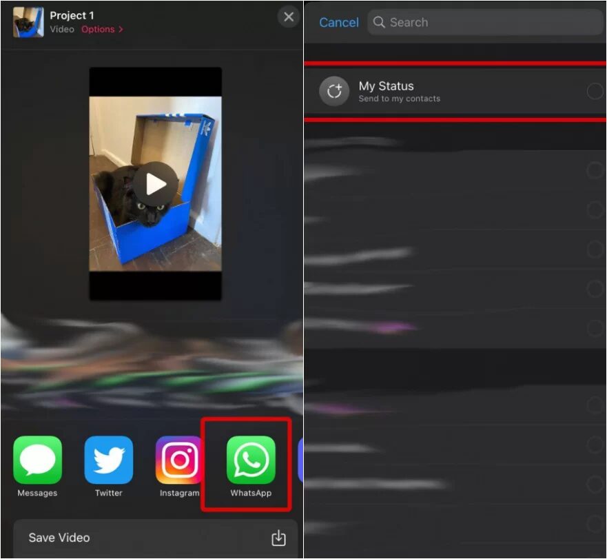 5. Para postar o vídeo diretamente no WhatsApp, basta selecionar o ícone do aplicativo de mensagens. Depois, na aba compartilhar, dê mais um toque;