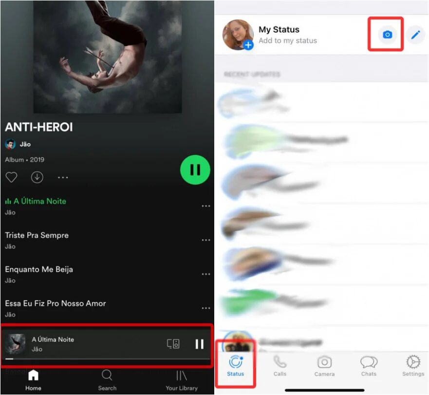 2. Abra o aplicativo do WhatsApp e toque em “Status” no canto esquerdo do display. Em seguida, toque sobre o ícone azul da câmera, na parte superior da tela;