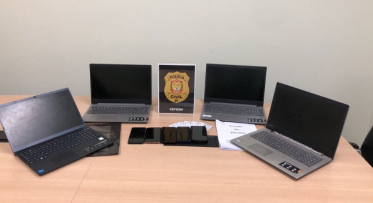 Durante as buscas nesta manhã no Itapoã e em uma imobiliária na região de Vicente Pires, as equipes da Delegacia de Combate à Ocupação Irregular do Solo e aos Crimes contra a Ordem Urbanística e o Meio Ambiente (Dema/Cepema) encontraram celulares, computadores, documentos de cessões de direito e folhas de cheque .