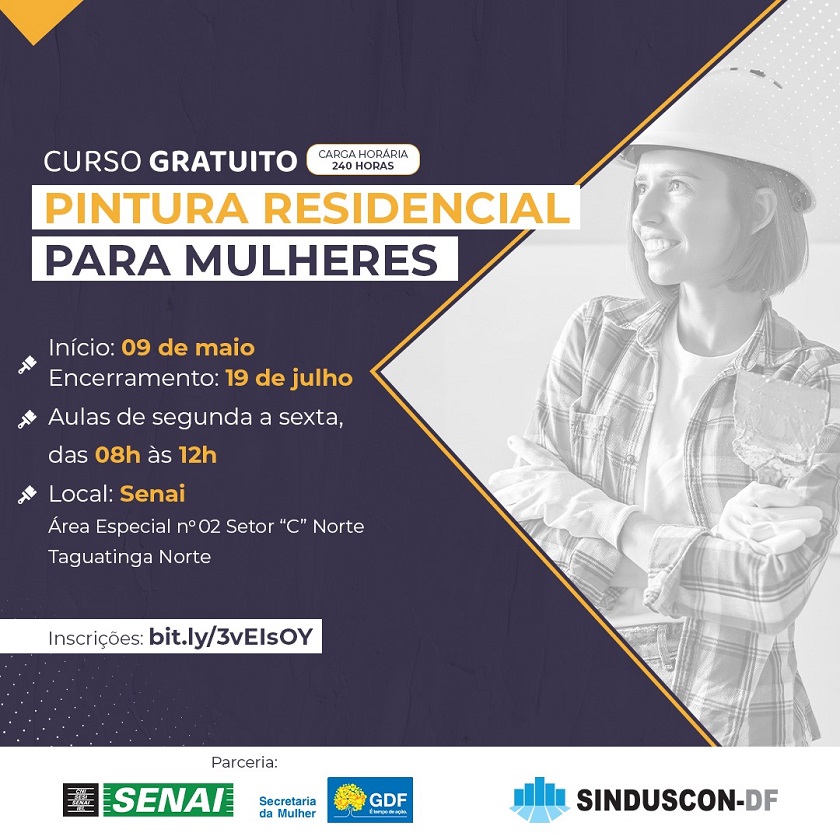 A Secretaria da Mulher (SMDF), em parceria com o Sindicato da Indústria da Construção Civil do Distrito Federal (Sinduscon-DF) e o Senai-DF, promove o curso de Aplicação de Revestimento Cerâmico, voltado para o público feminino. As inscrições são gratuitas e podem ser realizadas até o dia 12 de maio pelo cadastro do Empreende Mais Mulher. São 30 vagas disponíveis.