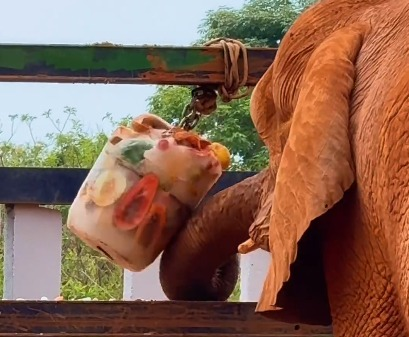 Uma das grandes atrações foi o enriquecimento ambiental especial para os elefantes Belinha e Chocolate, que ganharam picolé de frutas feito pela equipe de nutrição do zoo. A guloseima, com mais de 50 kg, atraiu os olhares curiosos do público. “É muito importante que os visitantes vejam como os animais se comportam naturalmente e entendam como esses estímulos são essenciais para o bem-estar deles”, explicou Wallison.