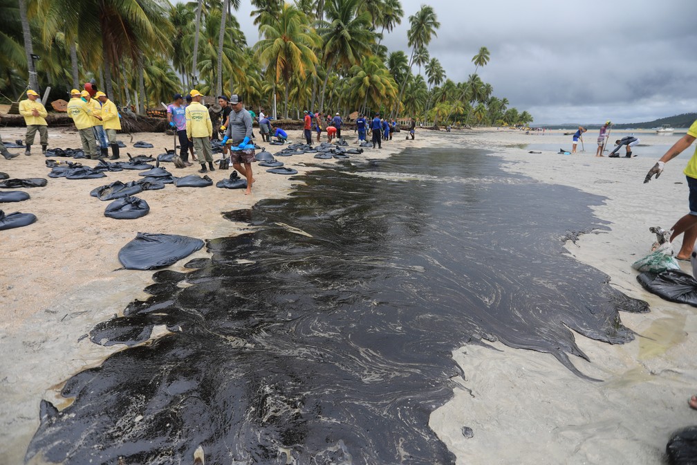 Duas toneladas de óleo foram retiradas de praias em Pernambuco entre domingo (2) e esta segunda-feira (3). Pedaços sólidos de óleo que se assemelham a petróleo cru foram encontrados inicialmente por um pescador na cidade de Tamandaré.