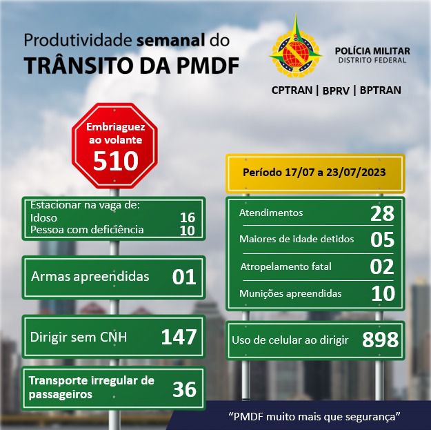 Entre os dias 17 e 23 de julho, a Polícia Militar do Distrito Federal (PMDF) registrou um alto índice de flagrantes envolvendo motoristas ao celular. Nos sete dias, foram registradas 898 autuações do tipo. A ocorrência foi a campeã do período.