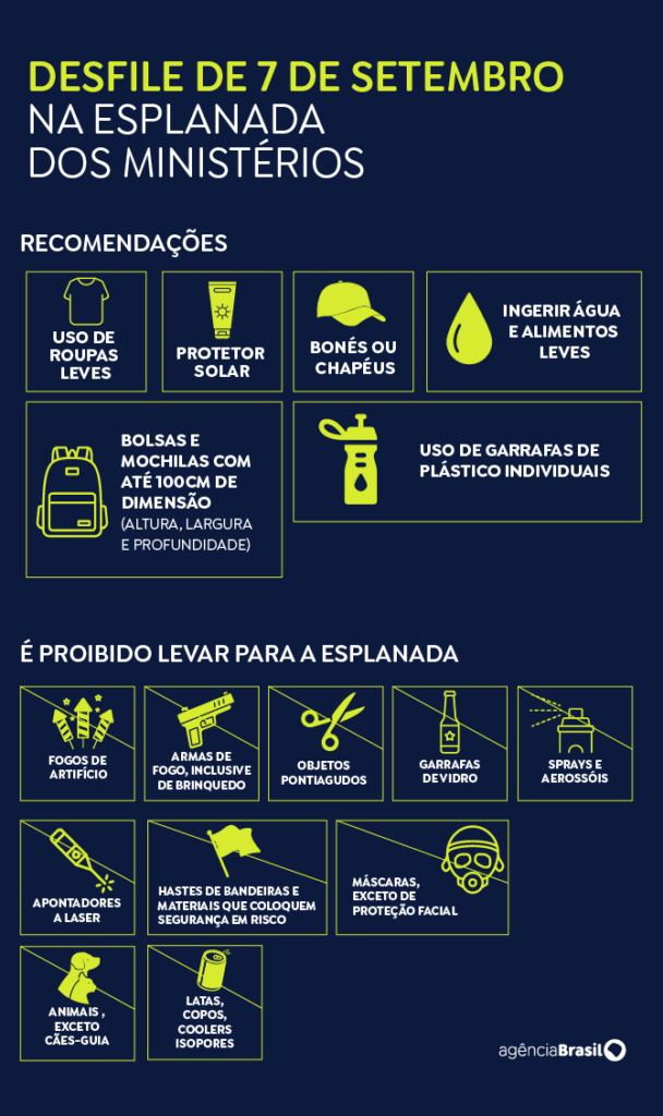 Não é permitido acessar a Esplanada com fogos de artifício, sprays e aerossóis, armas de fogo, inclusive de brinquedo, objetos pontiagudos, garrafas de vidro, latas, copos, coolers e isopores, apontadores a laser, máscaras de qualquer tipo, exceto de proteção facial, hastes de bandeiras e outros materiais que coloquem em risco a segurança do público presente. Bolsas e mochilas deverão ter até 100 centímetros na soma das dimensões (altura, largura e profundidade).