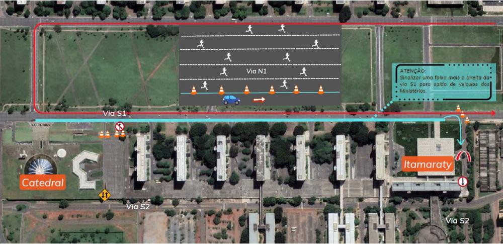 A partir das 6h30, a via S1 será bloqueada na altura do Museu da República, e o fluxo de veículos será desviado para a via L2 Sul. O tráfego que segue pela L2 Sul, no sentido Esplanada, será direcionado para o Buraco do Tatuí. Na Esplanada, a faixa mais à direita será destinada à saída de veículos dos ministérios. O fluxo seguirá até a altura do Itamaraty, onde será desviado para a via S2. O acesso ao estacionamento da Catedral será permitido apenas pelo túnel da Cúria, na via S2.