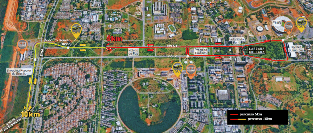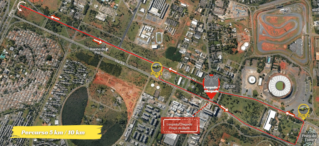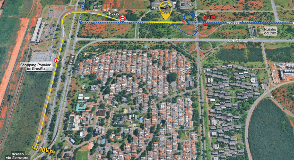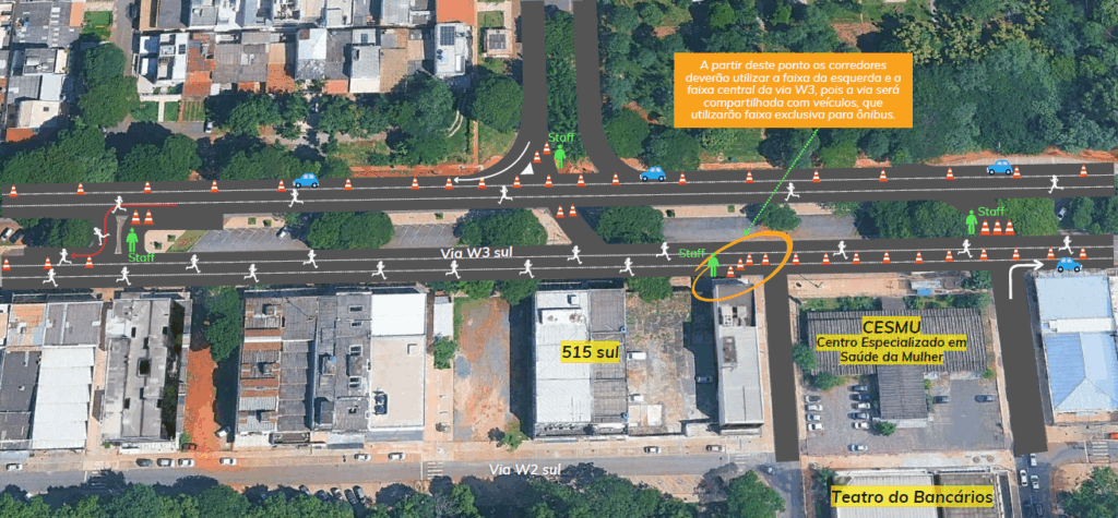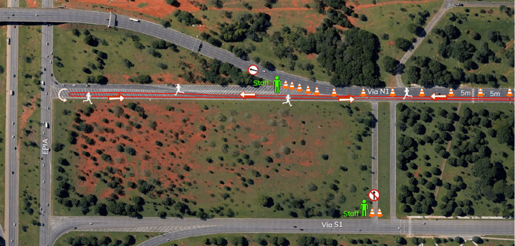 Na via S1, no trecho entre a Praça do Cruzeiro e a Torre de TV, as três faixas próximas ao canteiro central serão bloqueadas ao tráfego de veículos, ficando destinadas aos participantes da corrida.