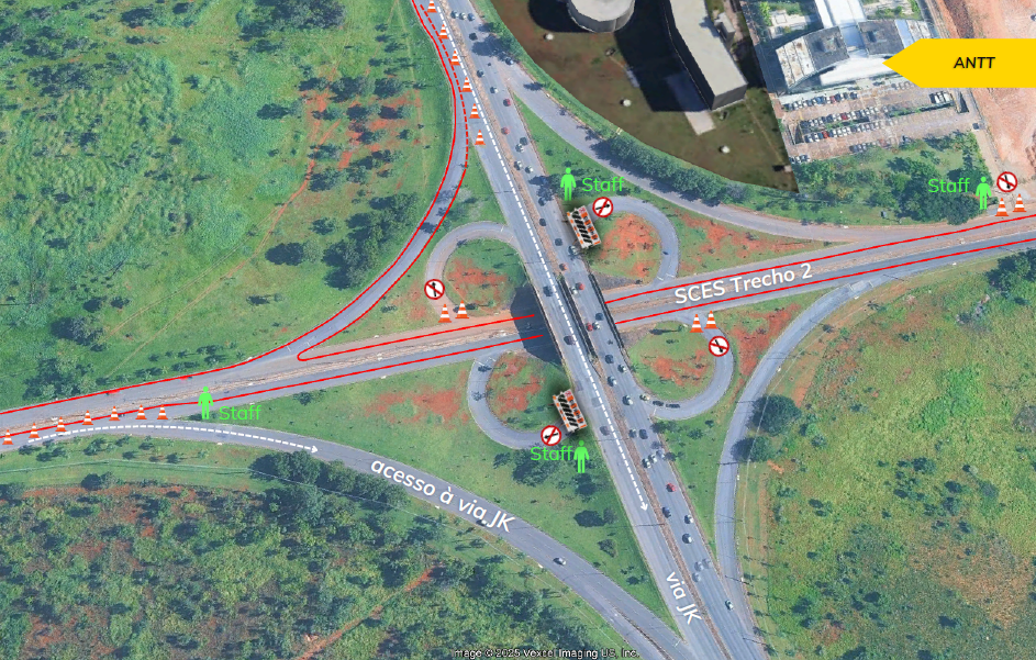 Na via JK, os agentes fecharão as tesourinhas de acesso à via SCES Trecho 2, tanto no sentido Lago Sul quanto no sentido Plano Piloto. Na via N1 Leste, a rotatória que dá acesso à via SCES Trecho 2 também será interditada. A previsão é que as interdições durem até as 10h.