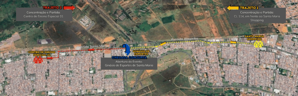 A caminhada contará com dois trajetos em direção ao Ginásio de Esportes. Os participantes concentrados em frente ao Santa Maria Shopping seguirão pela Avenida Alagados, enquanto o outro grupo partirá do Centro de Ensino Especial n° 1 e seguirá pela Avenida Santa Maria. Durante o deslocamento, os agentes de trânsito farão as interdições no trânsito necessárias para a passagem do público.