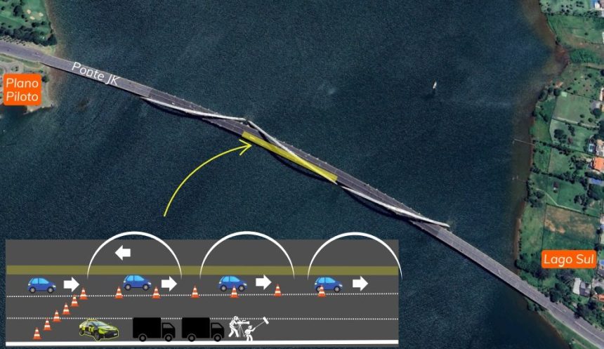 A partir das 3h30, será feita a interdição das faixas da direita e central, sentido Lago Sul, da cabeceira da Ponte JK até o final do segundo arco. A faixa da esquerda será liberada para o tráfego de veículos.