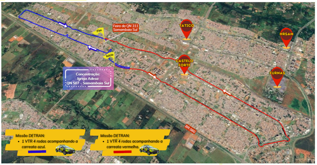 Das 8h às 11h de domingo (14), ocorrerá a Carreata pela Paz, em celebração ao Dia Nacional da Bíblia, em Samambaia Sul. Os fiéis se concentrarão na Igreja Evangélica Assembleia de Deus, na QN 507, de onde partirão em duas carreatas com percursos distintos, ambas com chegada na Feira da QN 311 Sul. Duas equipes do Detran-DF acompanharão os deslocamentos, realizando intervenções momentâneas sempre que necessário ao longo do percurso.