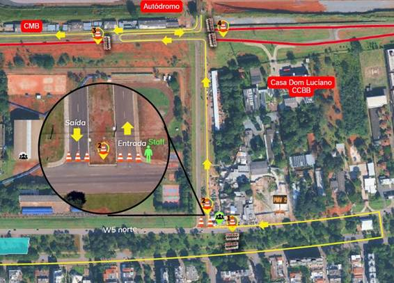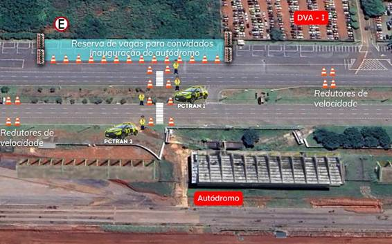 Para o evento marcado para quinta-feira (27), às 9h, no Autódromo, os agentes de trânsito irão interditar parte do estacionamento localizado em frente ao Depósito de Veículos Apreendidos (DVA-I), na SGAN 907. A sinalização será implantada ainda nesta quarta-feira (26), às 23h59. A área isolada será destinada aos convidados do evento. Além disso, ao longo da via SRPN será instalada sinalização para reduzir a velocidade dos veículos. Também será implantada uma faixa de pedestres provisória em frente ao DVA-I, visando aumentar a segurança dos participantes.
