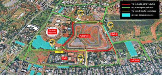 A via entre o Autódromo e o Estádio Nacional, no trecho em frente ao Complexo Aquático Cláudio Coutinho, será bloqueada até na altura da curva do Chinelo. Também serão fechadas a rotatória da Apub e a via SRPN, sentido W5 Norte.