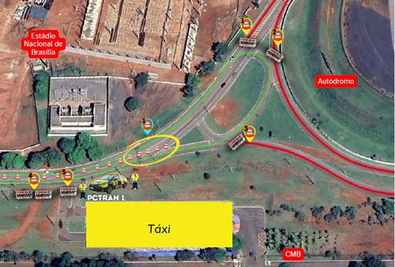 Na via contorno do Estádio Nacional de Brasília (ENB), na atura do Colégio Militar (CMB), será implantada sinalização para impedir retorno indevido e estacionamento no gramado. Além disso, os agentes vão desviar o fluxo da rotatória e fechar o estacionamento do CMB, que será destinado para táxi. As equipes do Detran-DF também farão o fechamento da via contorno do Autódromo, no acesso da via W5 Norte e na altura do CMB. O retorno da W4/W5 Norte, na altura da 704/705, também será bloqueado.