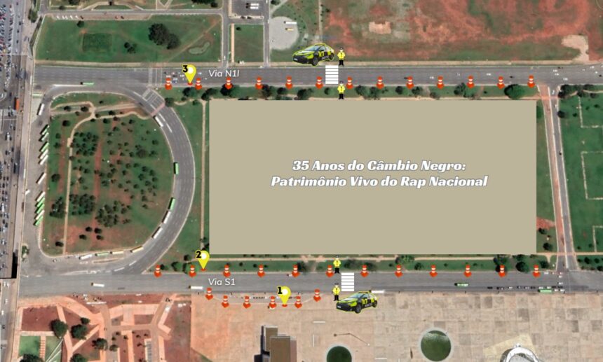 No sábado, ocorre o evento “35 anos do Câmbio Negro: Patrimônio Vivo do RAP Nacional”, na Esplanada dos Ministérios. A partir das 18h, o Detran-DF implantará sinalização temporária nas vias S1 e N1, na altura do primeiro quadrante da Esplanada, localizado em frente à Biblioteca Nacional de Brasília. O objetivo é impedir o estacionamento de veículos ao longo do meio-fio.