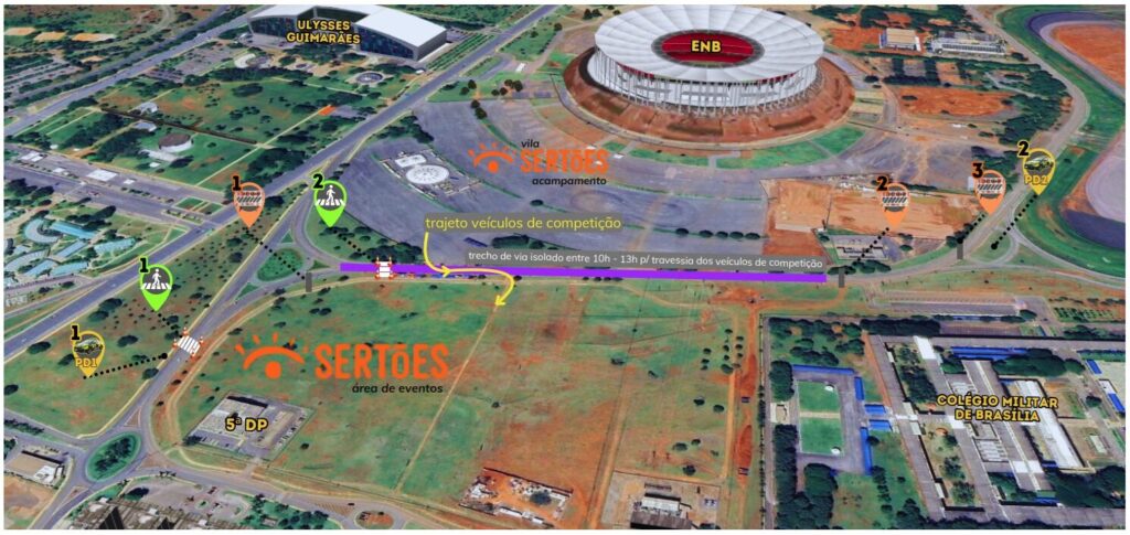 Na tarde desta sexta-feira (23), será realizado o Super Prime Sertões 2024 – evento que decide a pole position do Rally dos Sertões BRB, um evento de competição off-road. Para isso, das 8h às 22h, os agentes farão algumas intervenções no trânsito e implantarão travessia de pedestres sinalizadas para o público que vier dos estacionamentos no perímetro da feira da torre e próximo à entrada do evento principal. Entre 10h e 13h, haverá o fechamento do acesso da Via N2 para a Via contorno Estádio Nacional de Brasília (ENB), na altura da rotatória, e do trecho da Via Contorno próximo às rotatórias do Colégio Militar de Brasília e do autódromo, a fim para permitir a travessia dos veículos de competição da Vila Sertões (estacionamento ENB) para o evento Super Prime Sertões (gramado da 5ª Delegacia de Polícia).