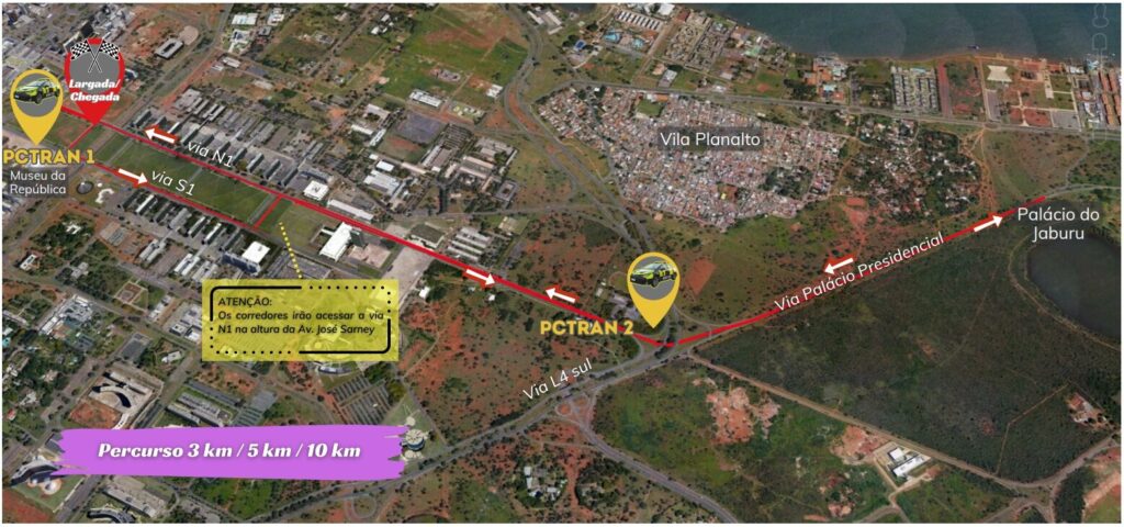 Das 16h às 20h de sábado (24), haverá intervenções no trânsito da Esplanada dos Ministérios para a corrida SBT Sports Sunset, com largada e chegada dos percursos de 3km, 5km e 10km na altura do Museu da República. A Via S1 terá apenas as três faixas da direita liberada para o tráfego de veículos; as três faixas próximas ao canteiro central serão destinadas aos atletas. Já na N1, somente uma faixa ficará livre para a saída dos veículos dos Ministérios e para aqueles que vierem pela L2 Norte. O acesso à Via N1 pela L4 Norte ficará fechado durante todo o evento. A Via Palácio Presidencial terá trânsito compartilhado: a faixa da direita destinada aos veículos e da esquerda, aos atletas.