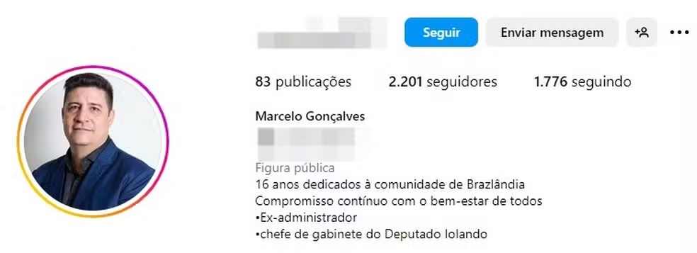 A TV Globo apurou que um dos alvos da investigação é Marcelo Gonçalves, ex-administrador de Brazlândia. Em suas redes sociais, ele afirma ser chefe de gabinete do deputado distrital Iolando (MDB) O g1 tenta contato com a defesa de Marcelo.