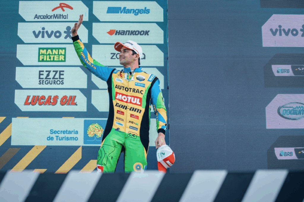 “Hoje foi sorte”, disse. “Mesmo assim, fiz uma bela corrida. Estava em quarto na pista, e assim já seria maravilhoso. E o mesmo safety-car que me ferrou lá em Cuiabá hoje me devolveu a vitória. Quero dedicar a vitória ao Daniel, meu filho, um aninho. Obrigado, Vanessa, por cuidar tão bem dele e da nossa família. Só tenho que agradecê-la por ser perfeita.”