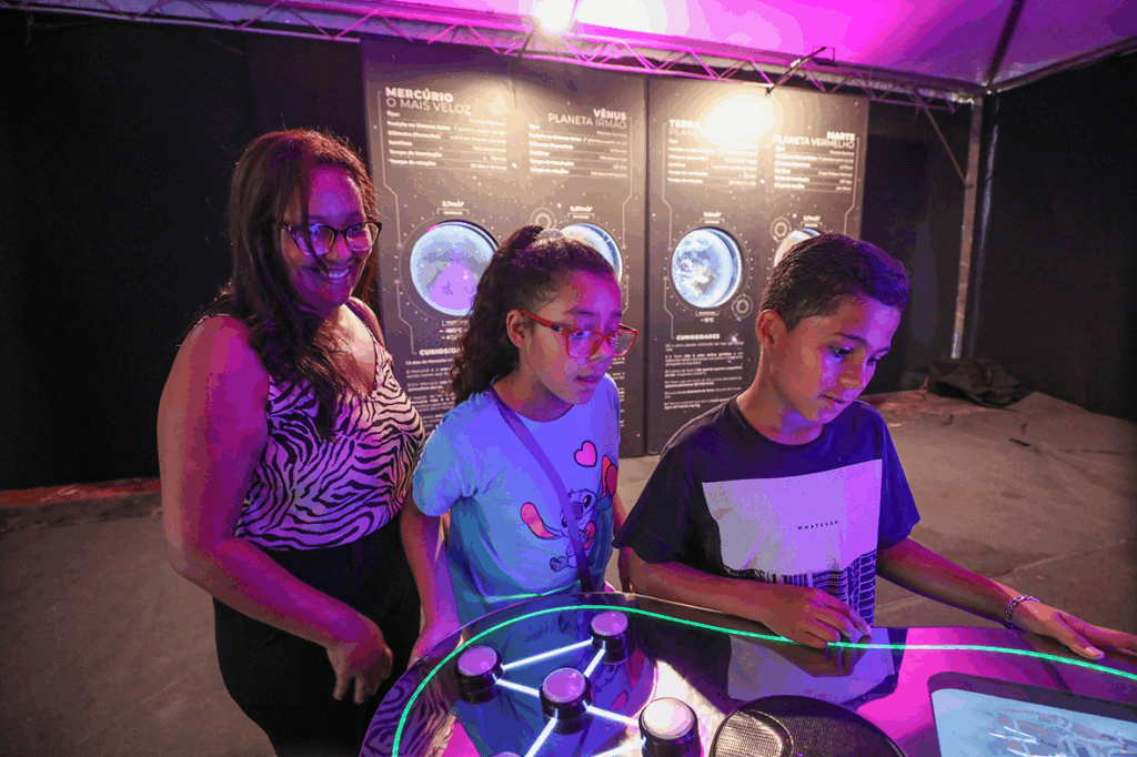 O foguete no centro da sala escura parece pronto para decolar. As luzes piscam, os planetas giram nas telas e, de repente, Eloá Nunes, de 7 anos, acerta a resposta: “Urano é o planeta mais frio do sistema solar!”.