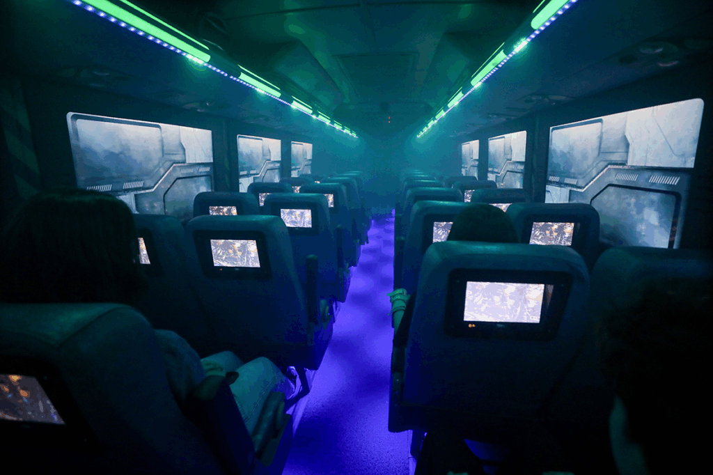 Ao lado do foguete, um ônibus aparentemente comum esconde um simulador imersivo. Quando as portas se fecham, o chão vibra, as luzes mudam de cor e o veículo parece atravessar dimensões. Na tela à frente, um robô guia a tripulação — a nave passa por florestas, mergulha no fundo do mar e sobrevoa galáxias, enquanto alerta sobre o aquecimento global e a preservação ambiental.