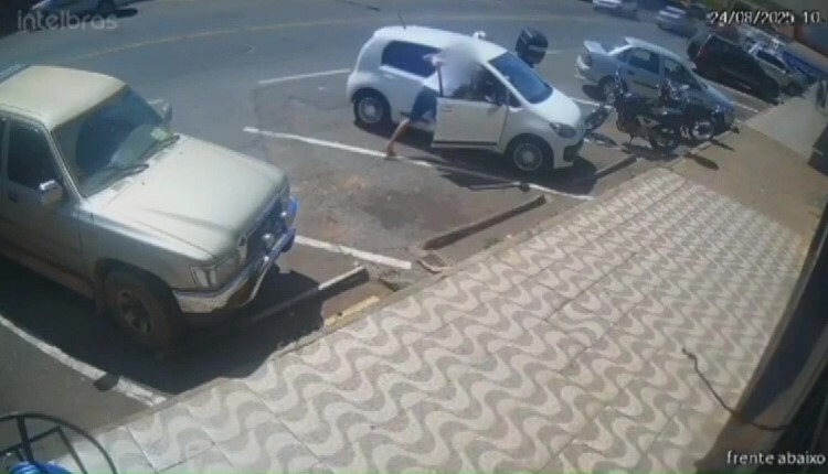 Nas imagens, nota-se que o suspeito discute com a comerciante. Ele tenta sair com o carro, mas já é barrado por uma viatura. Segundo relatos do adolescente aos policiais militares, as agressões começaram após ele enviar mensagens ao pai antes dele chegar ao veículo.