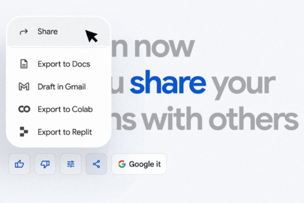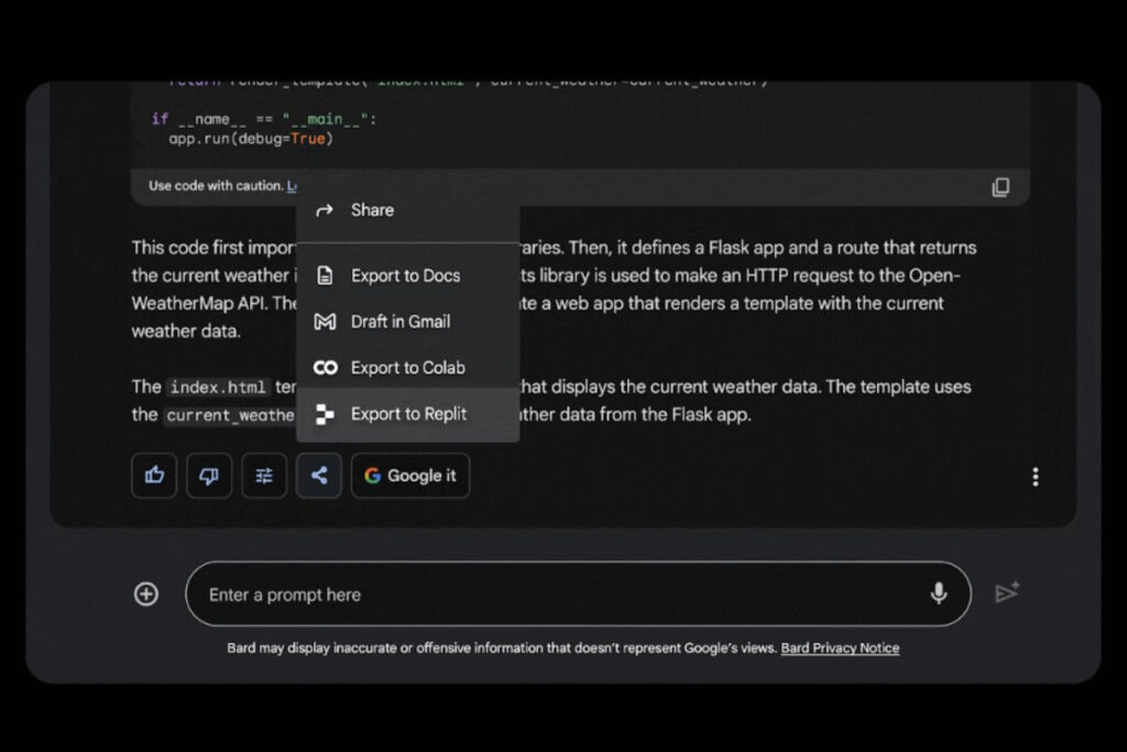 O Bard vai permitir exportar o código Python criado com a ajuda do Bard para o Replit, Docs e Colab de forma nativa ou até mesmo salvar como rascunho no Gmail. Assim, a ferramenta facilita a vida de quem usa inteligência artificial para programar.