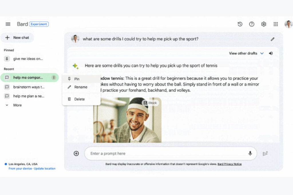 Um jeito simples de acessar o seu histórico de buscas no Bard. Ao abrir uma conversa com a inteligência artificial, será possível encontrar as opções de fixar, renomear e selecionar os chats recentes na barra lateral. Assim, fica mais fácil rever alguma informação importante dada pela IA.