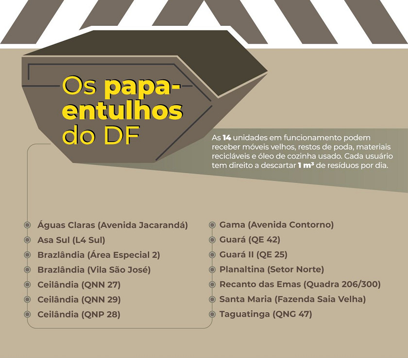 Atualmente, o DF tem 14 papa-entulhos – outras nove unidades devem ser entregues à população ainda neste ano. Todos os equipamentos estão abertos de segunda a sábado, das 7h às 18h, para receber móveis velhos, restos de poda, materiais recicláveis e óleo de cozinha usado. Cada cidadão pode descartar até 1 m³ de resíduos por dia.