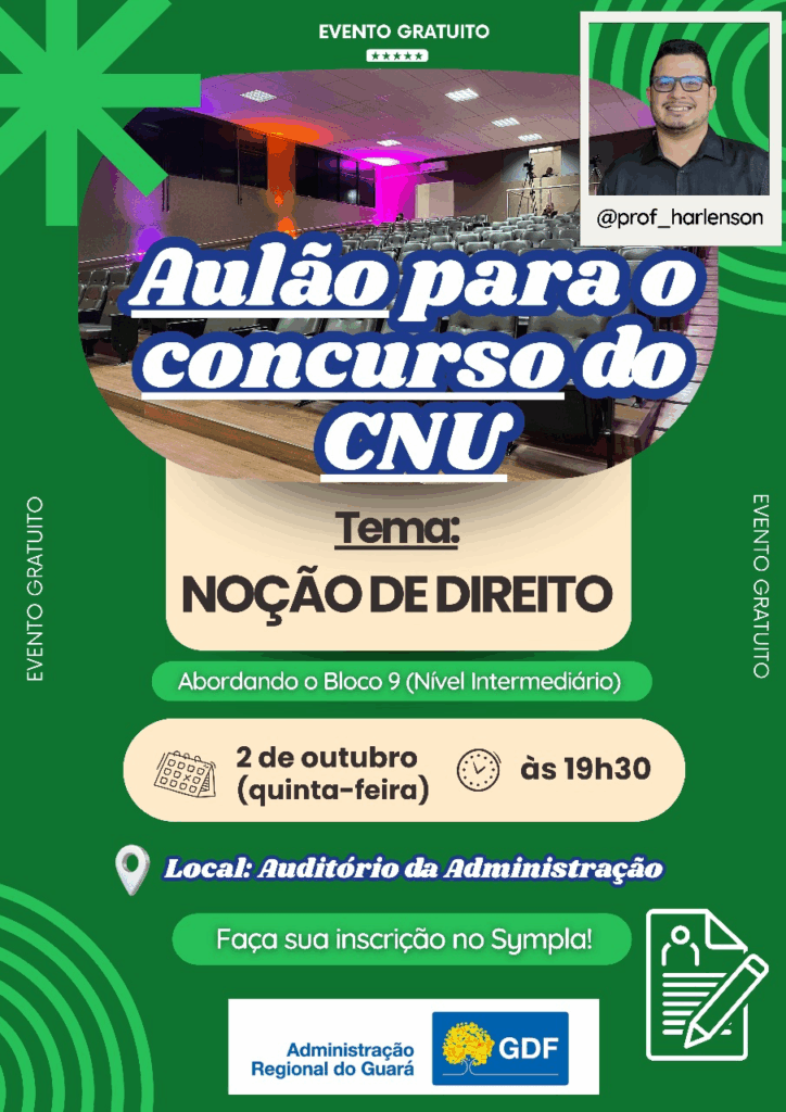 Para reforçar a preparação de candidatos ao Concurso Nacional Unificado (CNU), a Administração Regional do Guará vai promover, no dia 2 de outubro, às 19h30, um aulão gratuito sobre noções de Direito, com foco no Bloco 9 Nível Intermediário. O encontro será no recém-reformado auditório da Administração e contará com o professor Harlenson Fonseca, referência nacional na área.